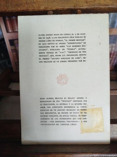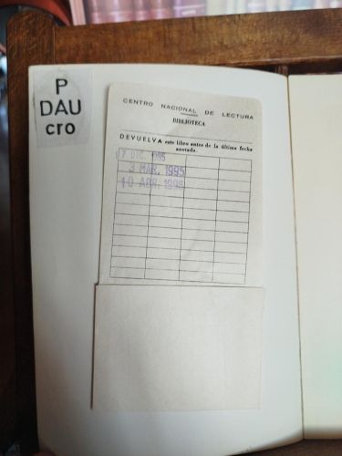 Mancha de pegamento de tejuelo en cubierta y contracubierta. Pequeños restos de fatiga en esquina inferior derecha de cubierta y contracubierta. Tejuelo en verso de cubierta junto a hoja de préstamo de biblioteca. Número de registro en bolígrafo con tinta negra en portada. Sello de biblioteca en portada. Interior en perfecto estado.