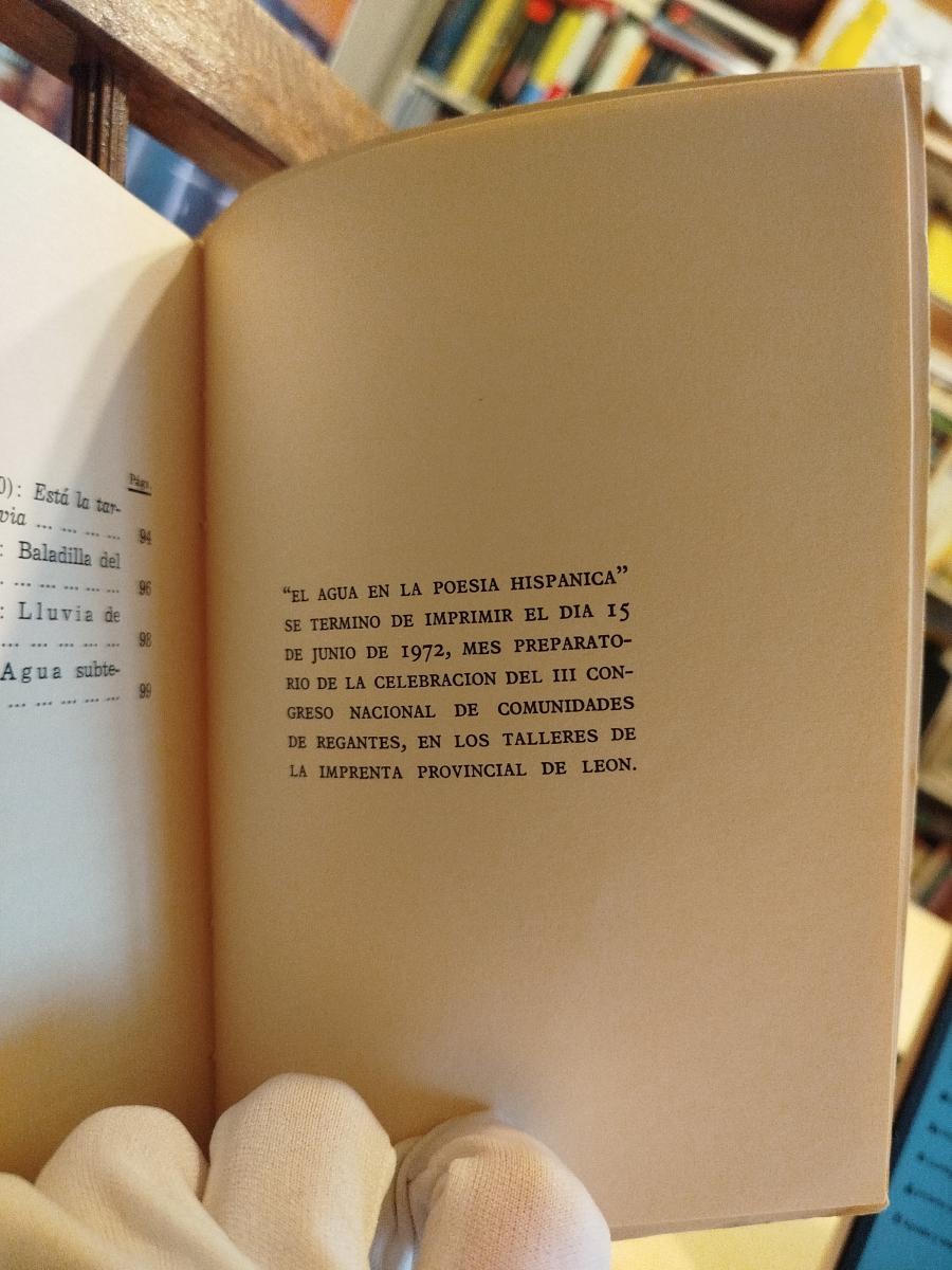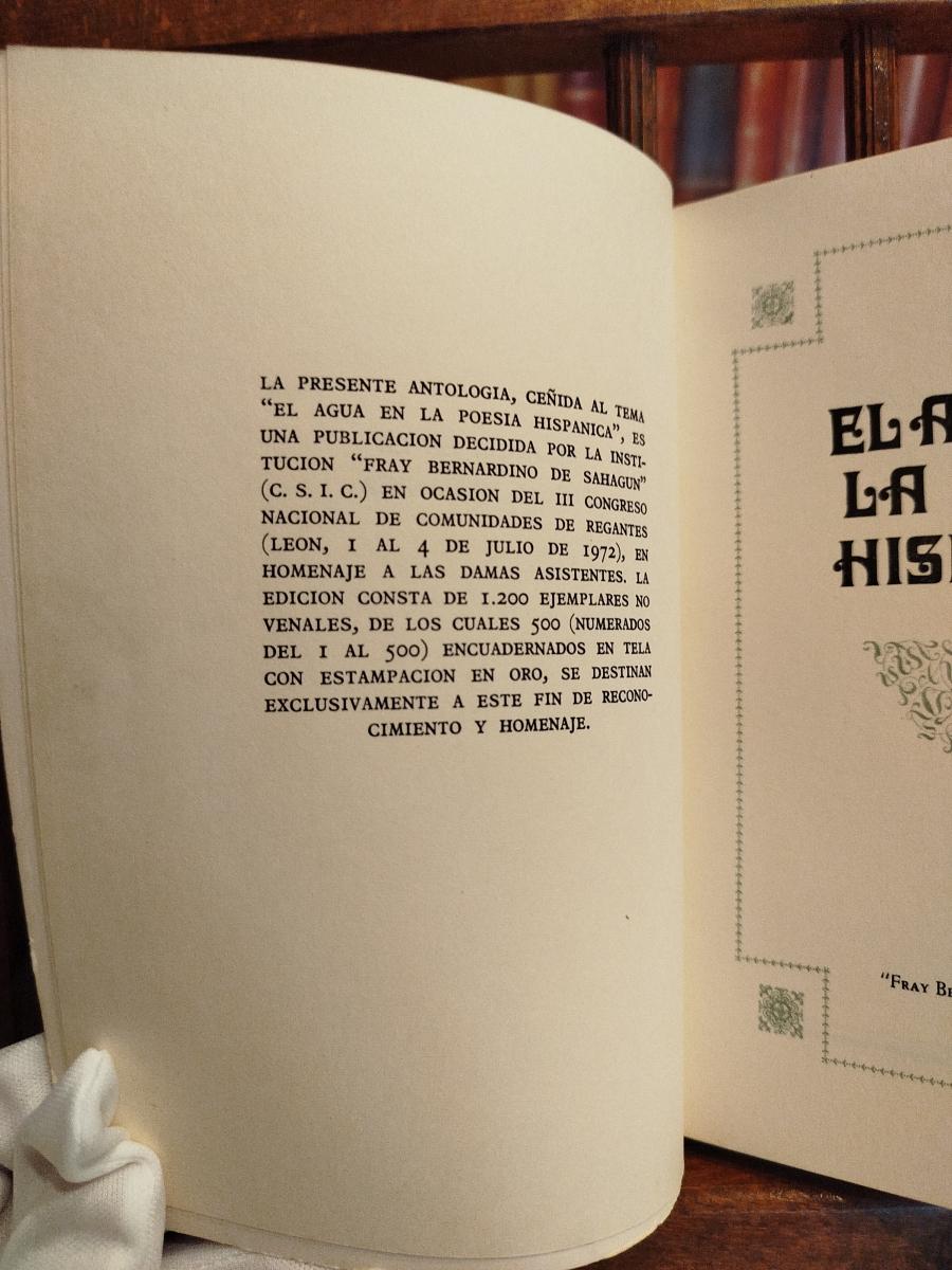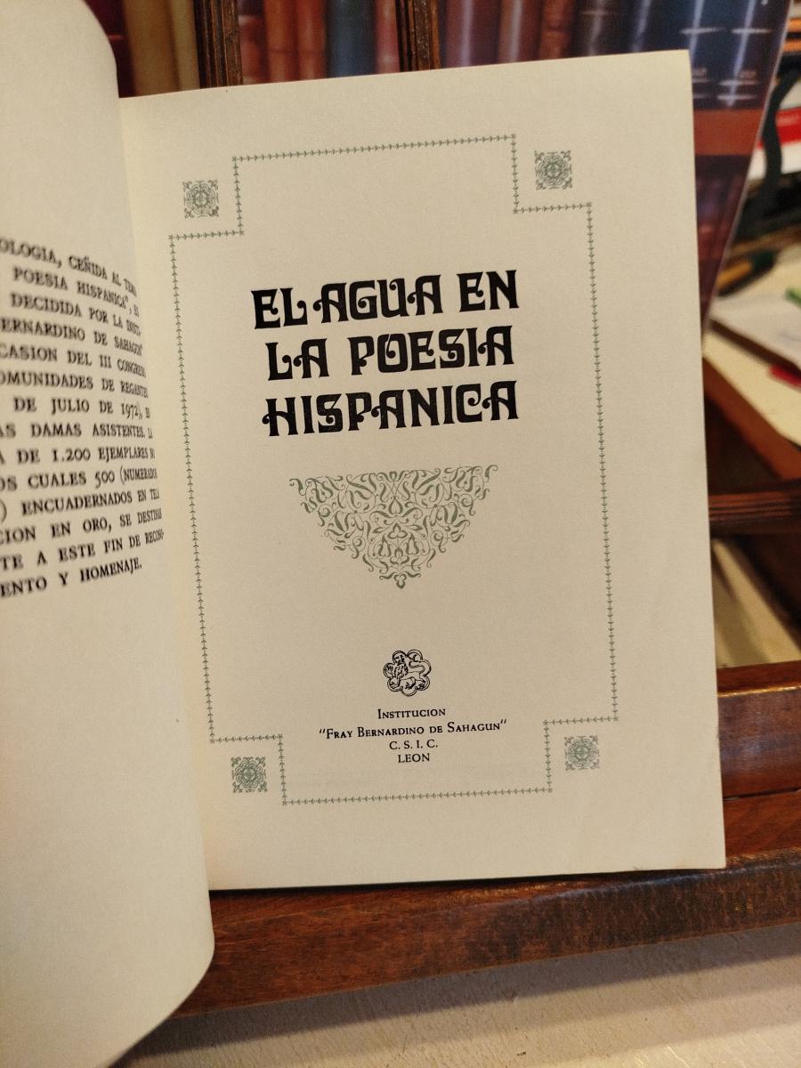 La presente Antología, ceñida al tema "El agua en la poesía hispánica", es una publicación decidida por la Insitución "Fray Bernardino de Sahagún" (C.S.I.C.) en ocasión del III Congreso Nacional de Comunidades de Regantes (León, 1 al 4 de julio de 1972)