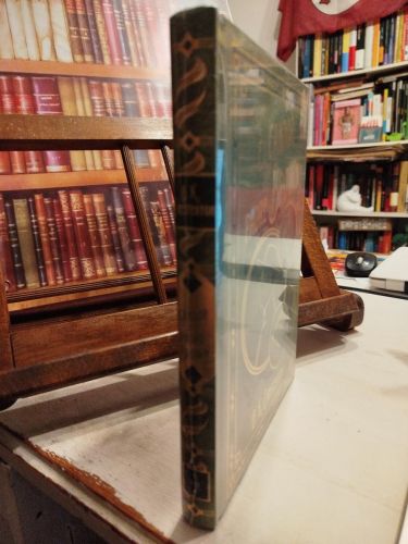 Cartoné con tela verde y encofrados dorados y negros en cubierta, contracubierta y lomo. Cinta de lectura en seda amarilla