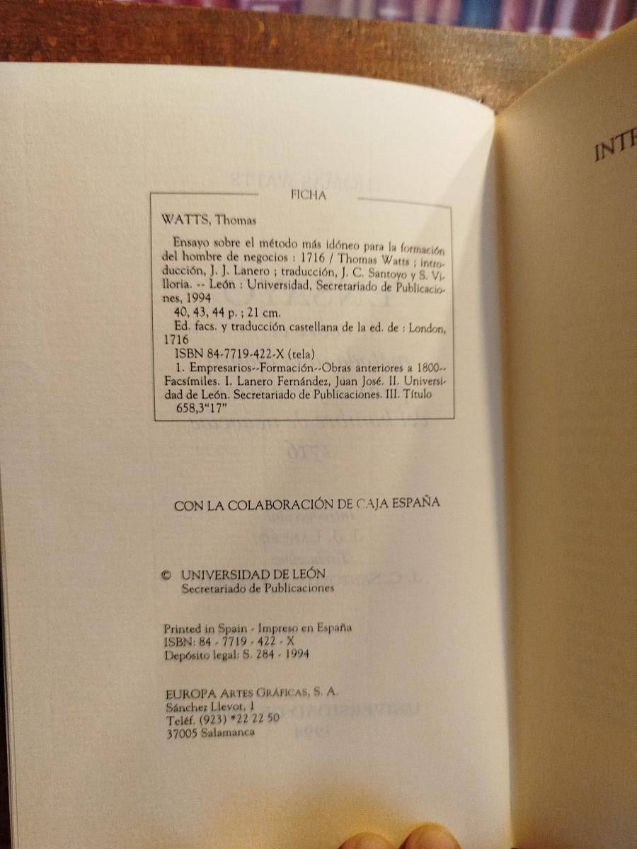 Ensayo sobre el método más idóneo para la formación del hombre de negocios: 1716