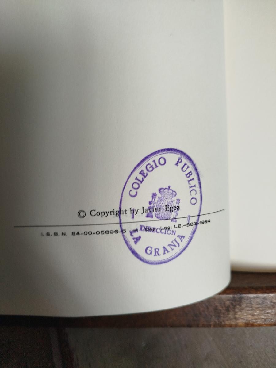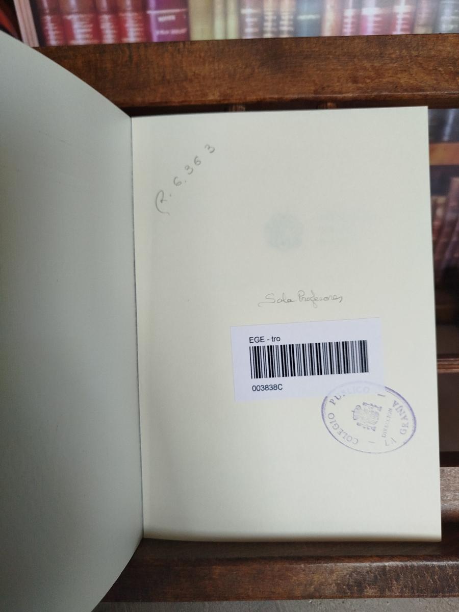 Tejuelo en el lomo. Sello en cubierta. Número de registro, código de barras y sello en hoja de respeto. Sello en datos de edición en contraportada.